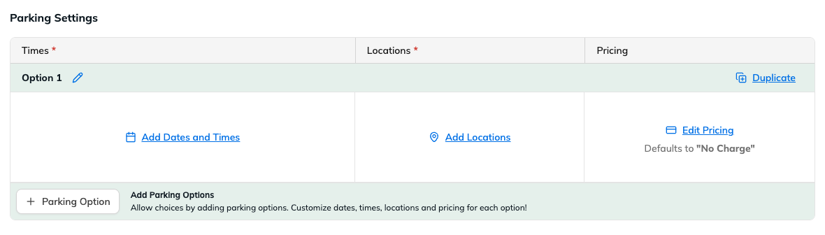 Parking settings are configured through Parking Options. Each option represents a specific parking configuration (e.g., different durations, times, or prices).