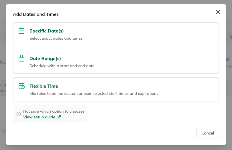 Use flexible time when you want to give parkers control, and fixed dates when the schedule is predefined.