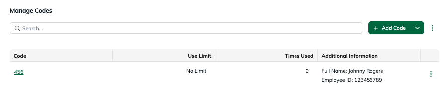 - Codes are managed in a searchable table