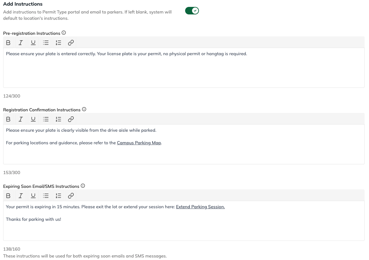 Add custom instructions that are shown to parkers at different stages of the experience.